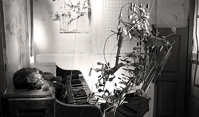 Dans une pièce minuscule, un pianiste est assis face à son instrument. Derrière lui, une fenêtre, devant lui, un mur qui se confond avec le ciel. Sur sa droite, une porte, à l’évidence trop petite pour qu’il ait pu l’emprunter pour entrer ou envisager de s’y glisser pour sortir. Son corps est constitué́ uniquement de fragments de piano : touches, cordes, marteaux, feutres…