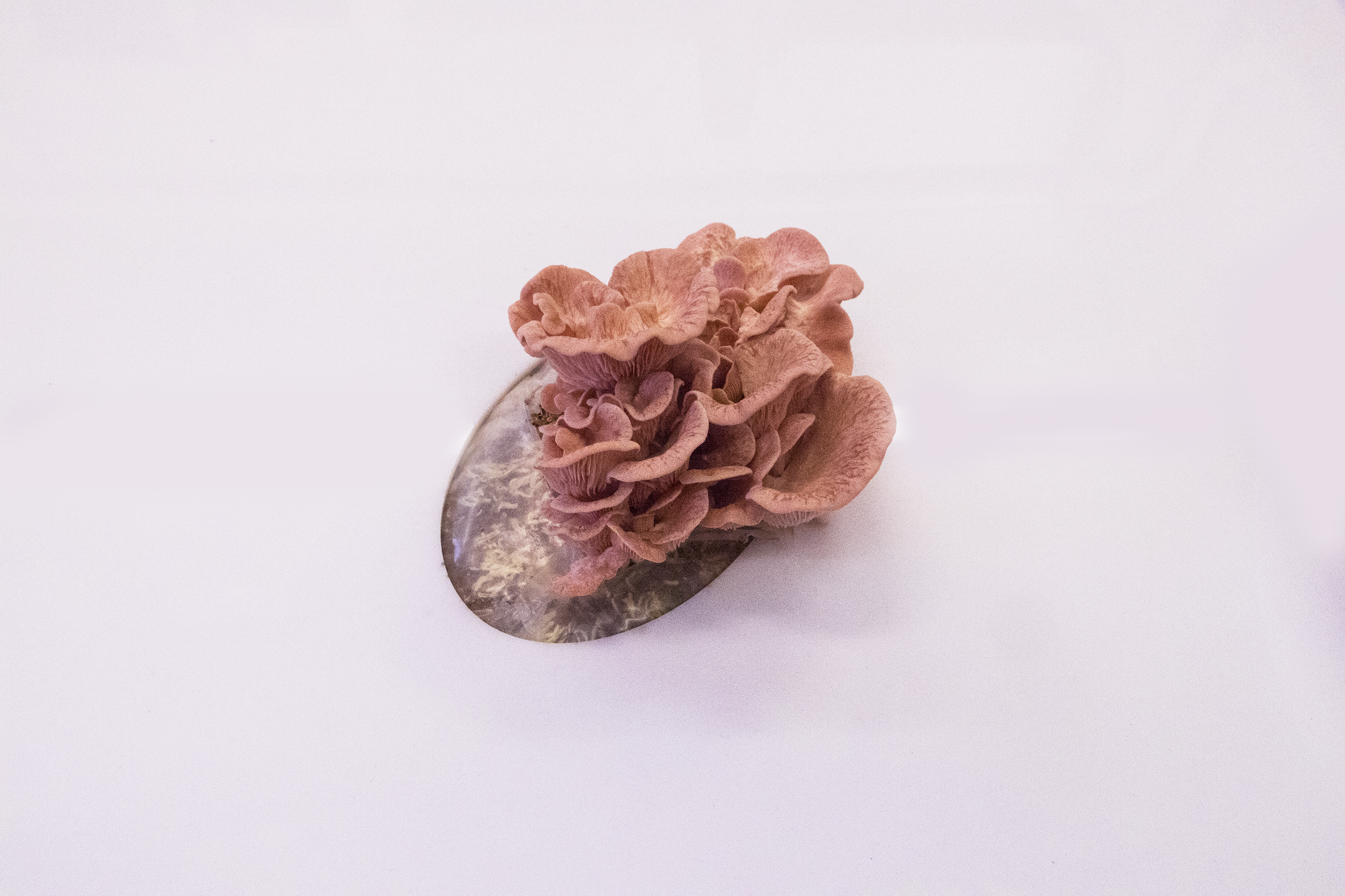 Ni parfaitement végétal, ni exactement animal l’univers fongique s’est emparé de Marine Nouvel, qui en retour s’est promis d’en explorer les ramifications. Sujets plastiques, écologiques, présent partout et invisibles souvent, les champignons apportent avec eux des matières, des odeurs, des couleurs, des mystères. Mycellanées c’est un laboratoire de recherches graphiques, de cultures, de mise en scène botanique et de pédagogie autour des secrets que recèlent ces petits êtres. En vidéo, le corps devient un mycélium où les spores sur la chair déploient leurs fruits veloutés. Mais il y a aussi les fioles, les éprouvettes, les bocaux, où s’épanchent des oreilles de diables suspendues dans le temps, la table d’opération pâle et froide d’où émergent d’autres mycoses, des planches anatomiques d’organes parasités, des poèmes échappés des lamelles et des bulbes... et d’autres espaces encombrées de fungus, sous d’autres formes encore ; en bref finalement, des Mycellanées.