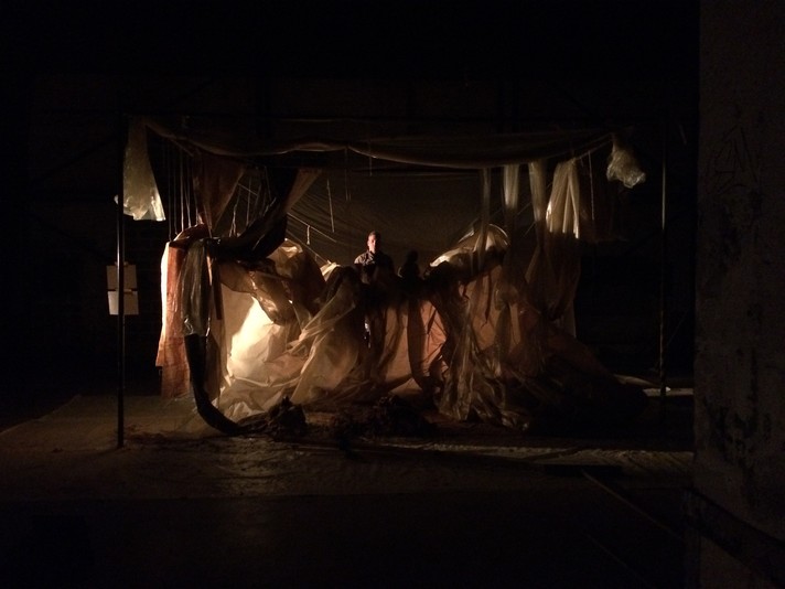 Dans un rapport physique, intime et charnel, il établit un dialogue intense et fusionnel entre lui et la matière. Des bruits, des sons, des lumières évoquent l’état brut de ce personnage mystérieux et libre dans son art.